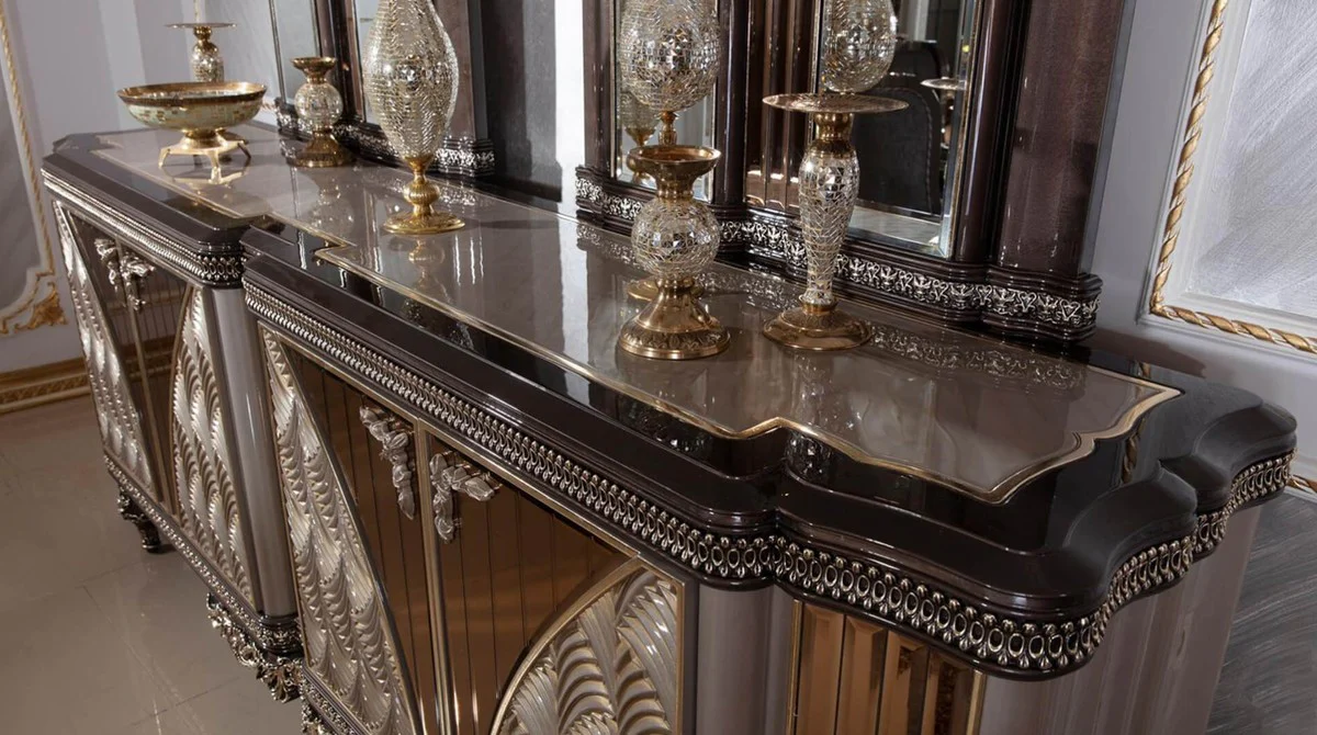Casa Padrino conjunto de muebles barrocos de lujo gris / negro / plata / oro - 1 Aparador Barroco con 4 Puertas y 2 Espejos de Pared Barroco - Muebles Barroco Hechos a Mano - Noble y Magnífico