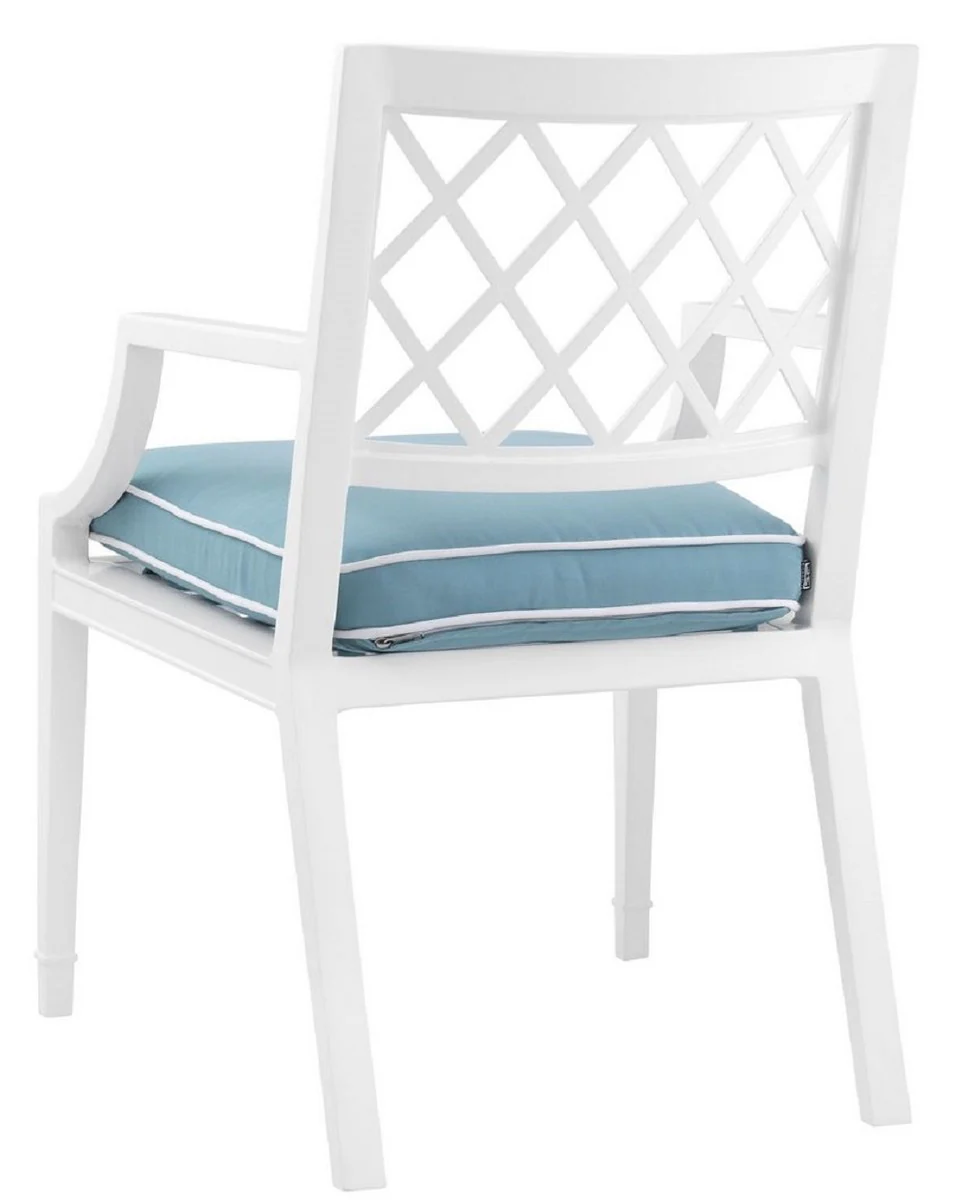 Casa Padrino silla de comedor de lujo con reposabrazos y coj¨ªn blanco / azul claro 60 x 66 x H. 87 cm - Silla de Cocina de Aluminio - Muebles de Comedor