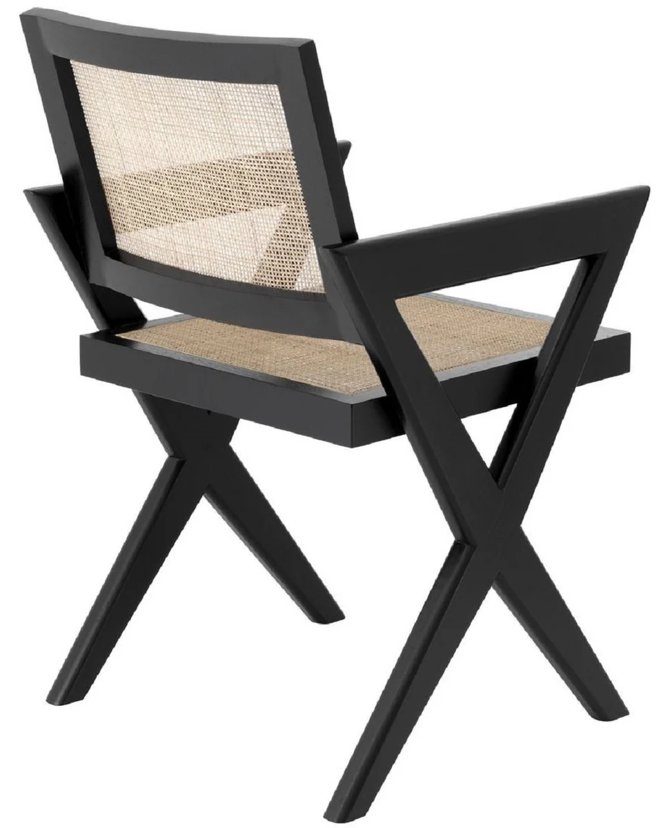 Casa Padrino silla de comedor de lujo negro / natural 53 x 57 x A. 84,5 cm - Silla de madera maciza con reposabrazos y rat¨¢n tejido a mano - Muebles de comedor de lujo