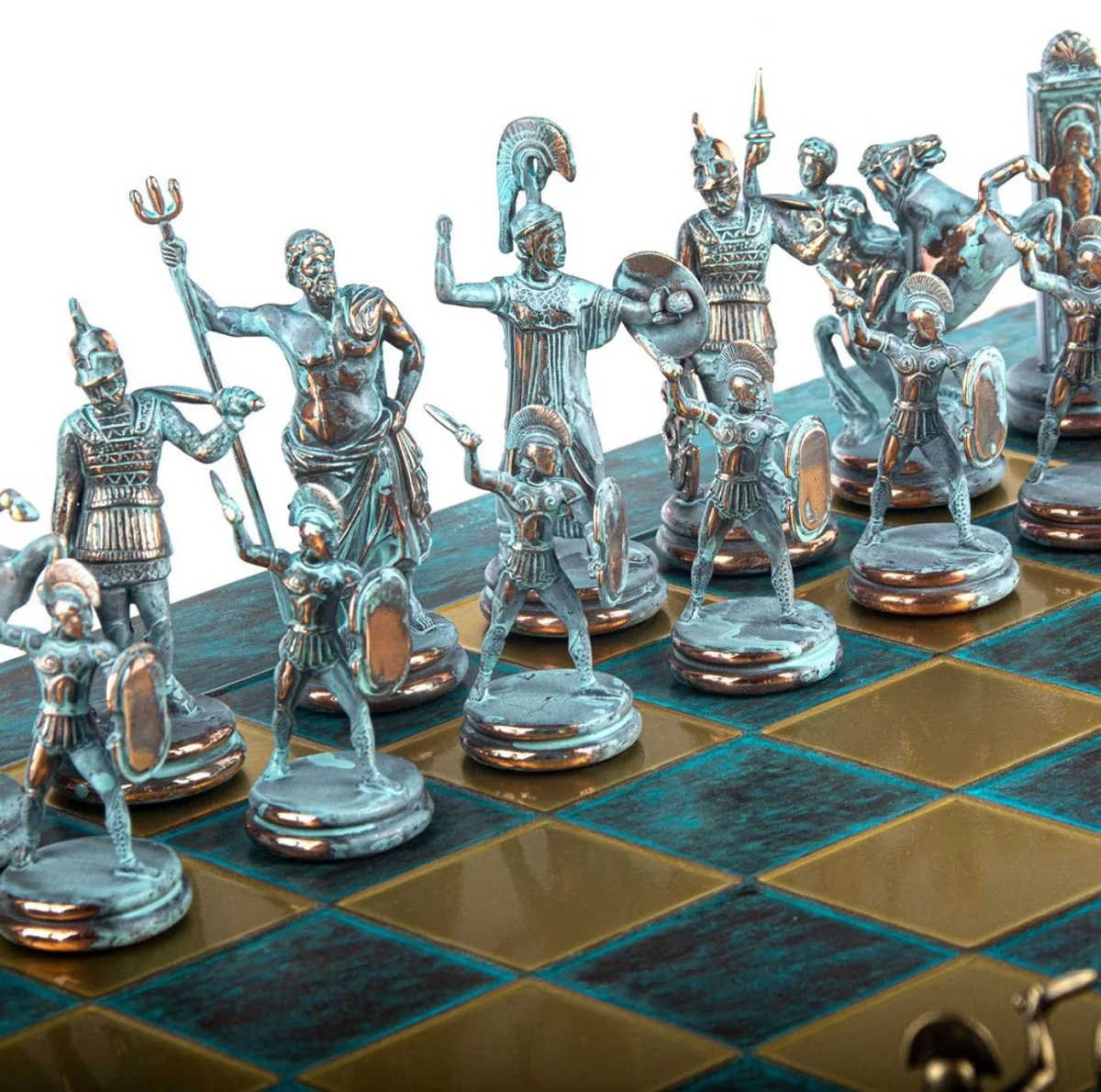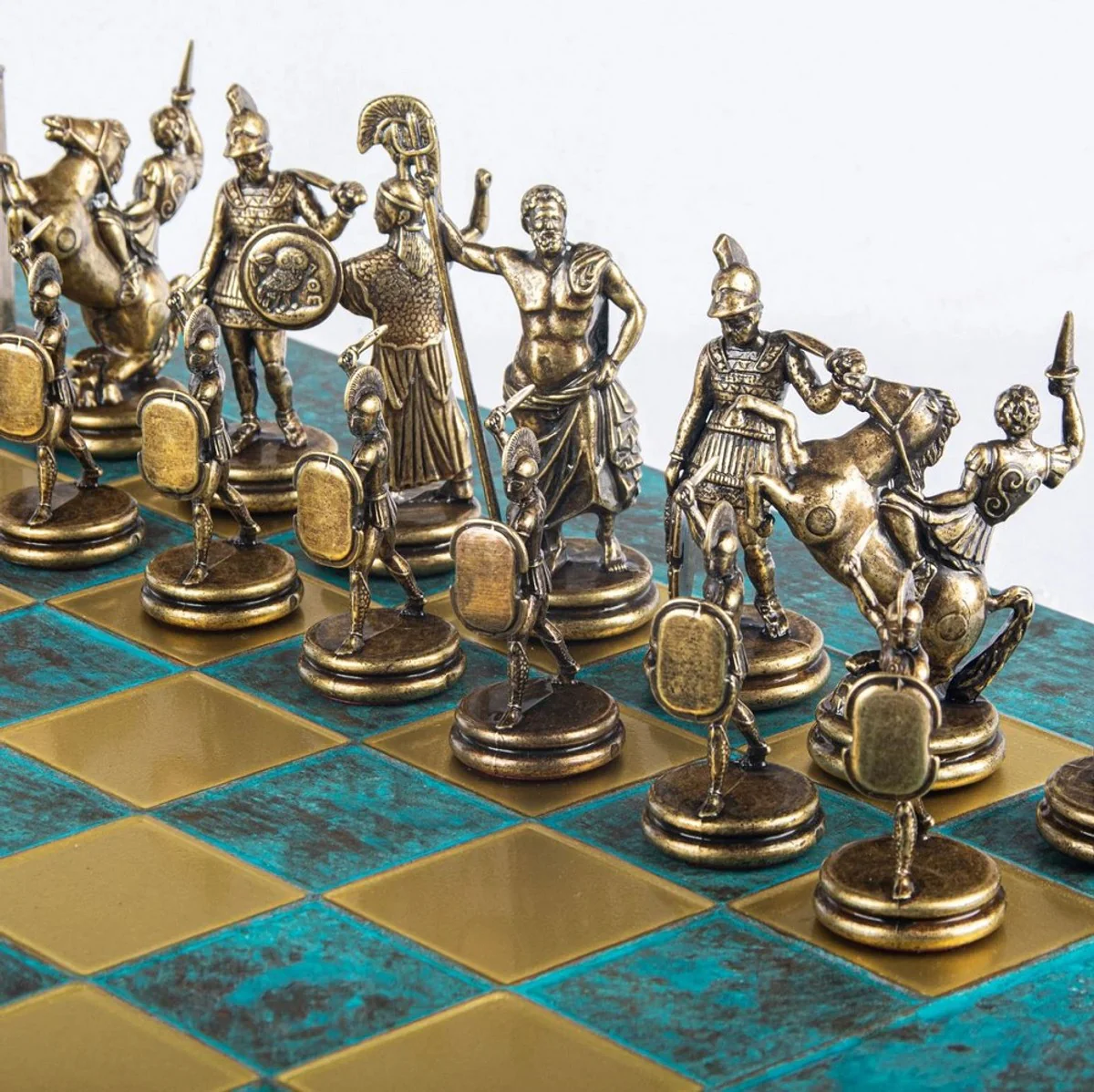 Casa Padrino conjunto de ajedrez de lujo turquesa / lat¨®n 54 x 54 cm - Conjunto de ajedrez griego - Tablero de ajedrez de lat¨®n con piezas de ajedrez - Accesorios decorativos de lujo