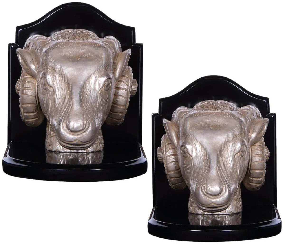 Casa Padrino conjunto de sujetalibros de lujo cabezas de carnero plata / negro 21 x 19 x A. 18 cm - Decoración de escritorio - Decoración de salón - Accesorios de Decoración