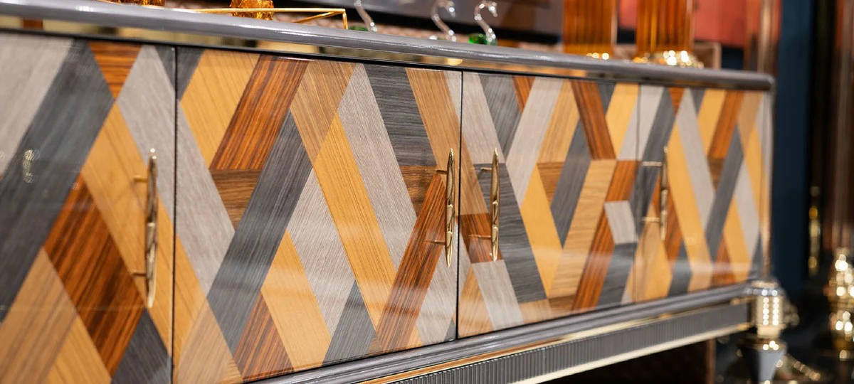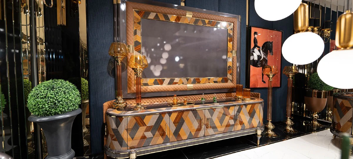 Casa Padrino conjunto de TV Art Deco de lujo multicolor / marr¨®n / gris / oro - Aparador de sal¨®n de madera maciza con pared trasera de TV - Muebles de sal¨®n Art Deco de lujo