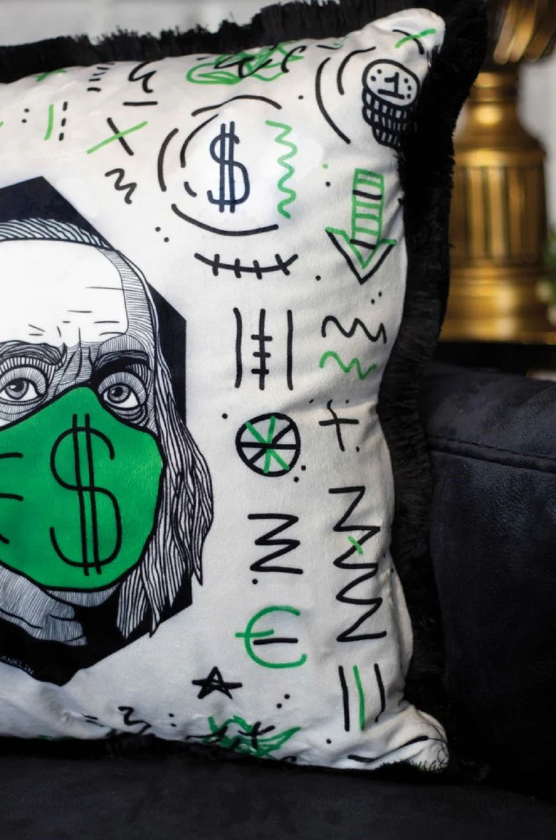 Casa Padrino cojín decorativa de lujo blanco / verde / negro 45 x 45 cm - Almohada de terciopelo estampado con flecos - Accesorios decorativos de lujo