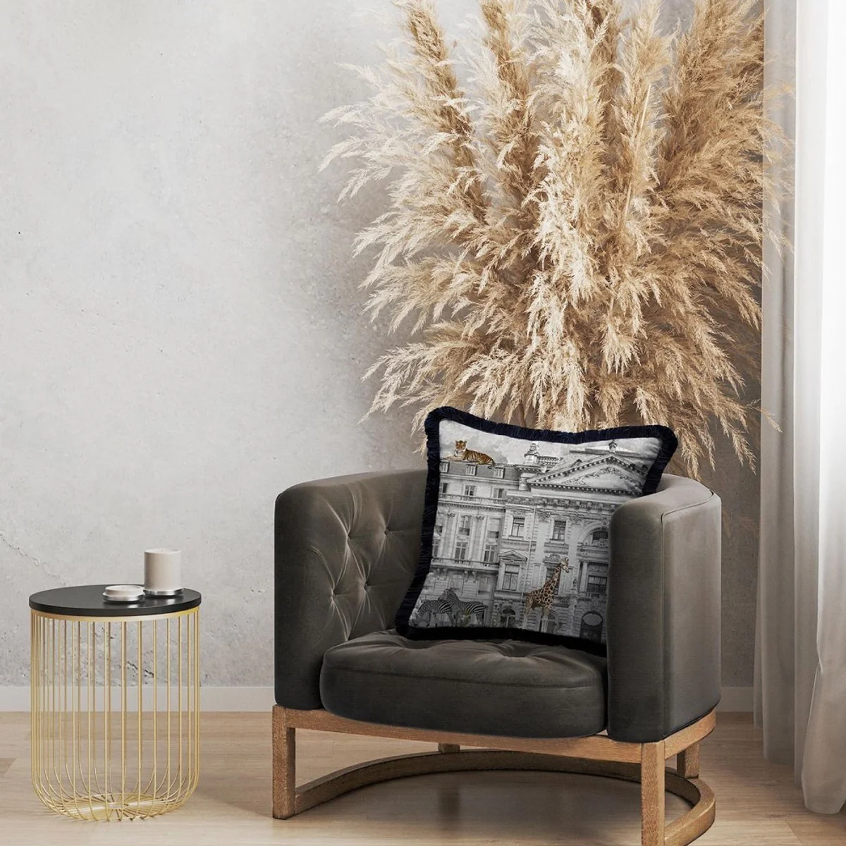 Casa Padrino cojín decorativa de lujo magnífica casa y animales gris / multicolor / negro 45 x 45 cm - Almohada de terciopelo estampado con flecos - Accesorios decorativos de lujo