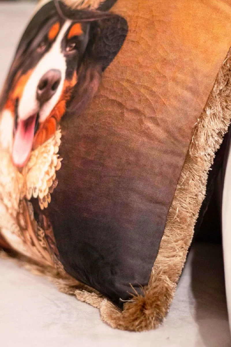 Casa Padrino cojín decorativa de lujo señor san bernardo multicolor / marrón 45 x 45 cm - Almohada de terciopelo estampado con flecos - Accesorios decorativos de lujo
