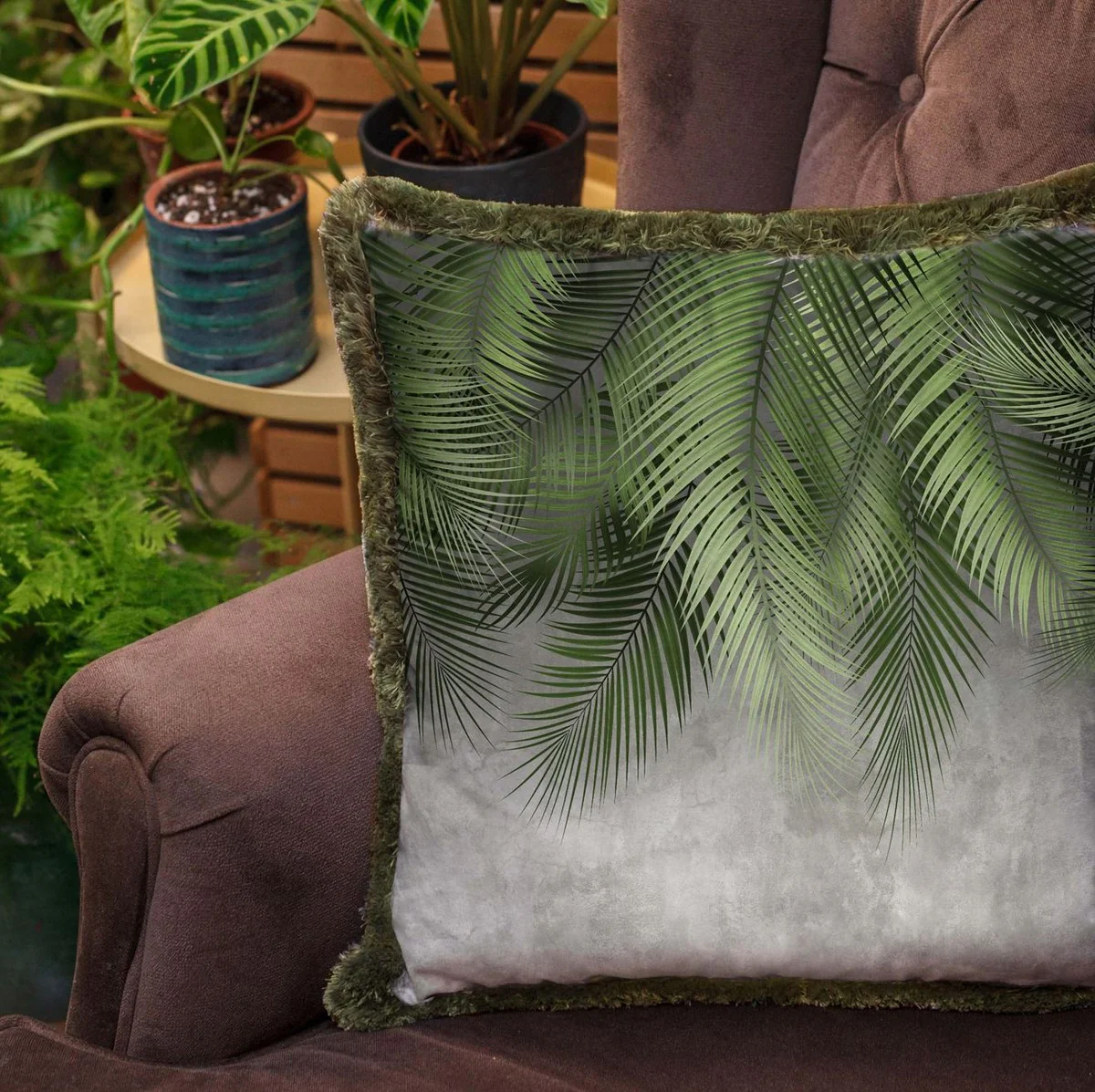 Casa Padrino cojín decorativa de lujo hojas de palma gris / verde 45 x 45 cm - Almohada de terciopelo estampado con flecos - Accesorios decorativos de lujo