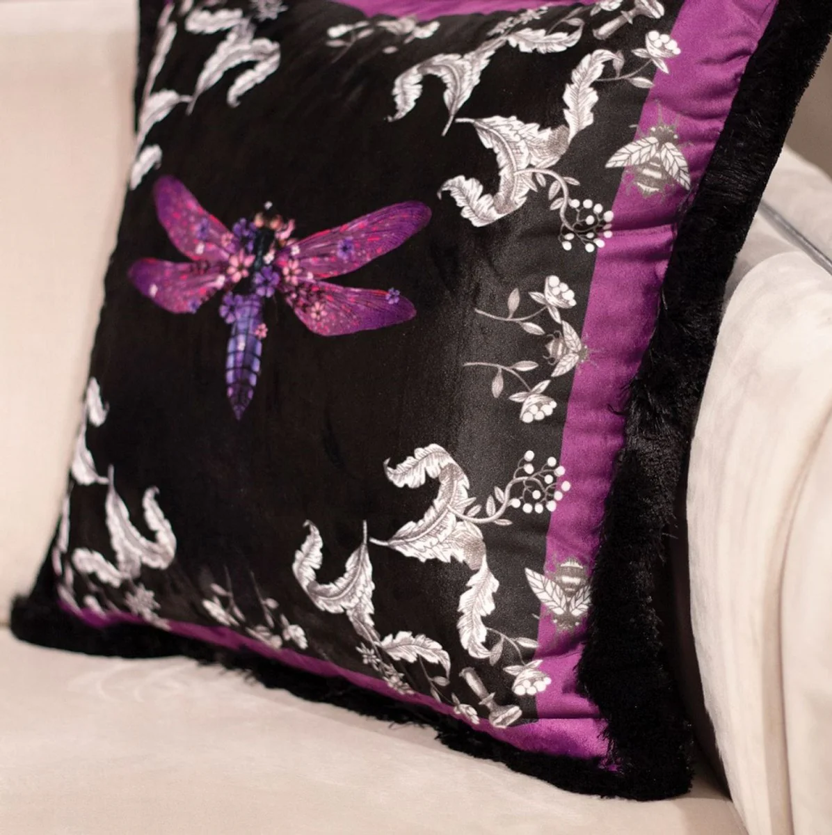 Casa Padrino cojín decorativa de lujo libélula y flores púrpura / gris / negro 45 x 45 cm - Almohada de terciopelo estampado con flecos - Accesorios decorativos de lujo