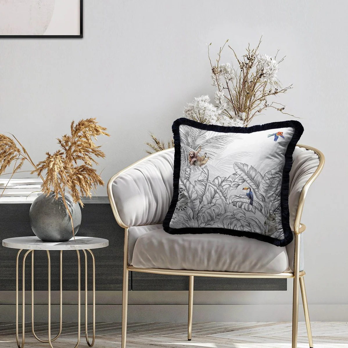 Casa Padrino cojín decorativa de lujo selva y animales gris / multicolor / negro 45 x 45 cm - Almohada de terciopelo estampado con flecos - Accesorios decorativos de lujo