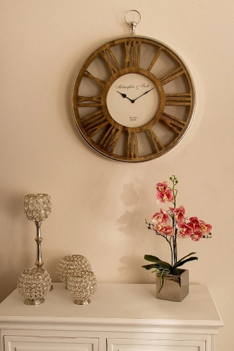 Casa Padrino reloj de pared de lujo en el diseño de un antiguo reloj de bolsillo plata / natural de Ø 50 cm - Reloj Redondo Decorativo con una Esfera de Reloj de Madera sin Tratar