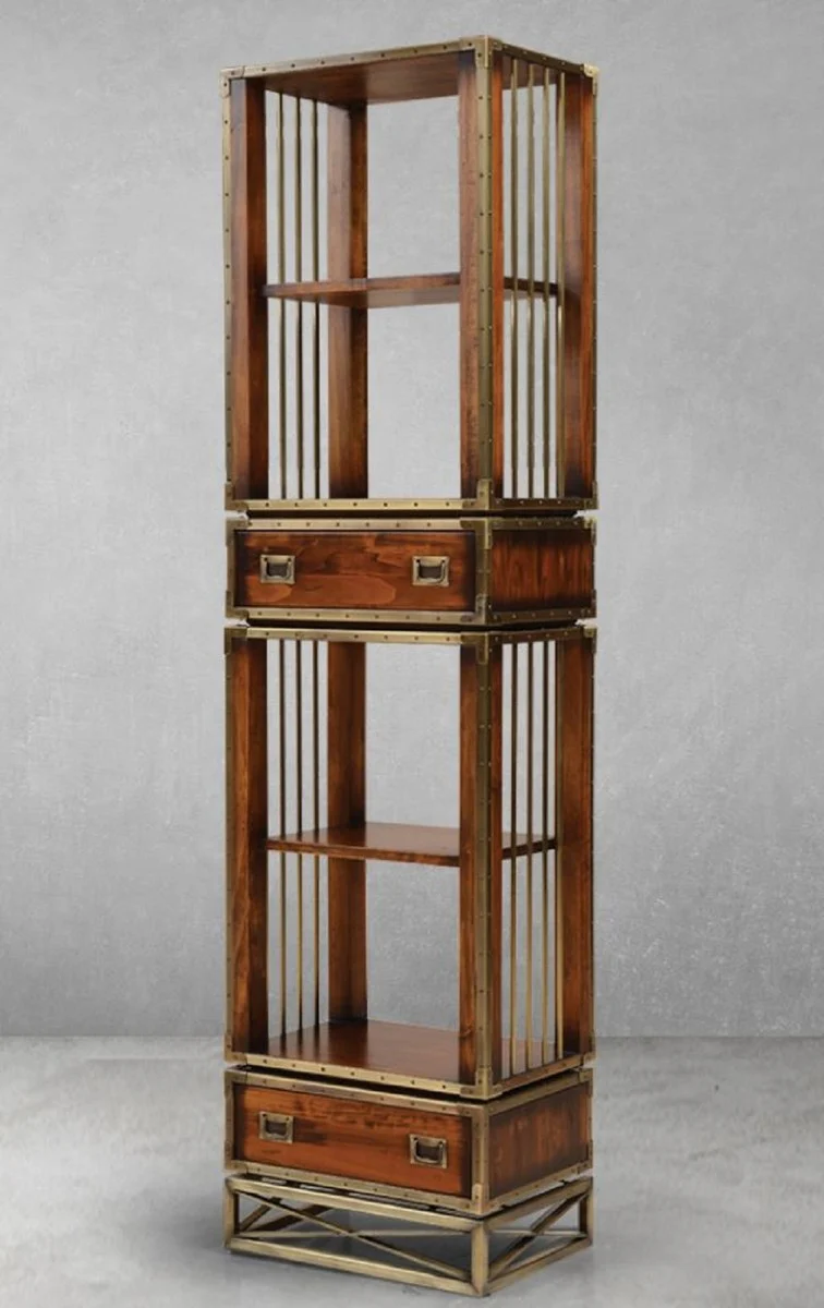 Casa Padrino armario estante de estilo vintage de lujo marrón / latón 152 x 35 x A. 200,5 cm - Armario de libros de estilo vintage con 6 cajones - Muebles de salón de lujo en estilo vintage