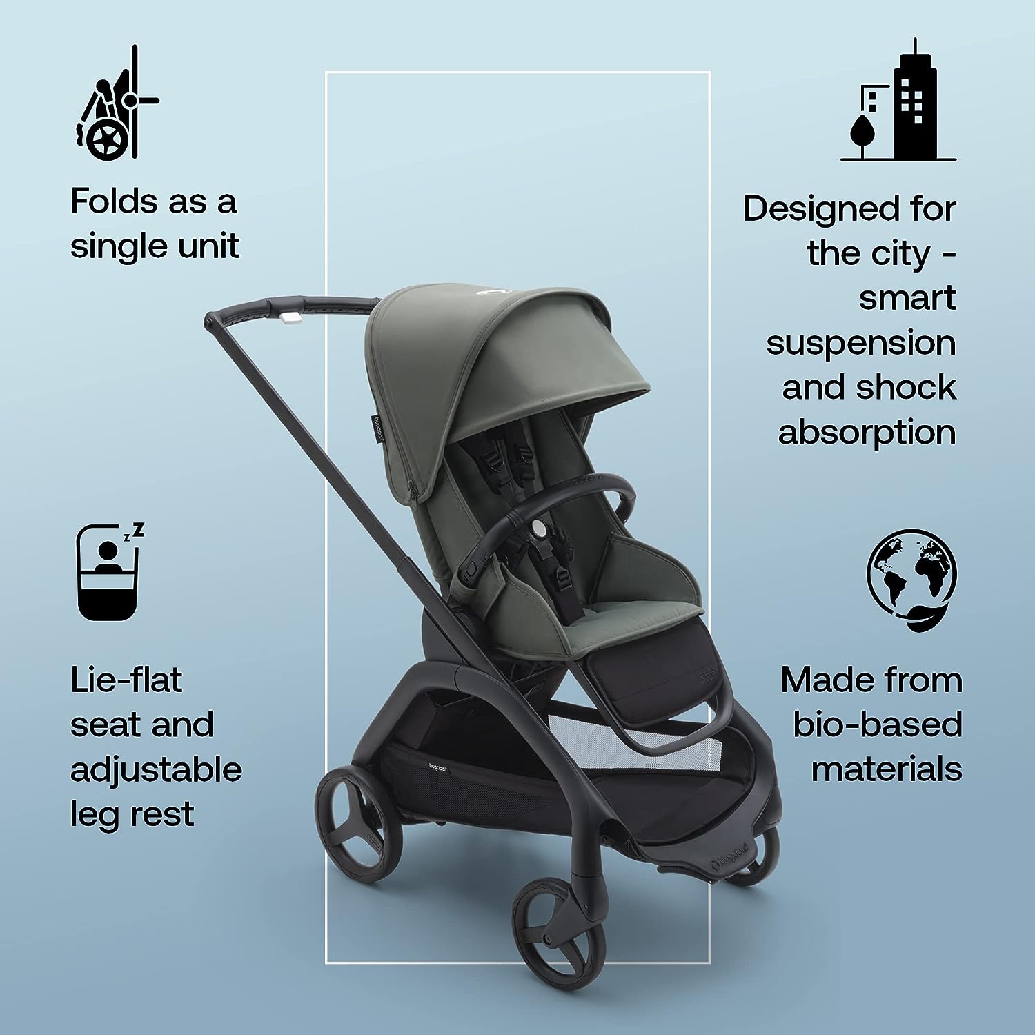 Bugaboo Dragonfly City Stroller, Lightweight Compact Baby Stroller with One Hand Easy Fold in Any Position, Full Suspension, XL Underseat Basket, Black Chassis and Forest Green Sun Canopy