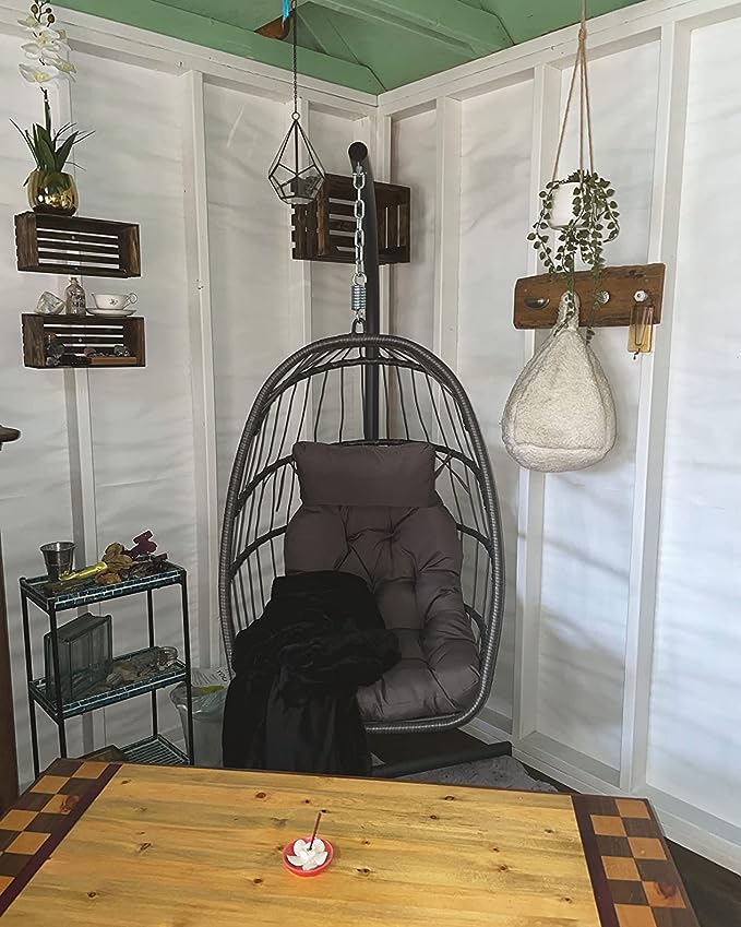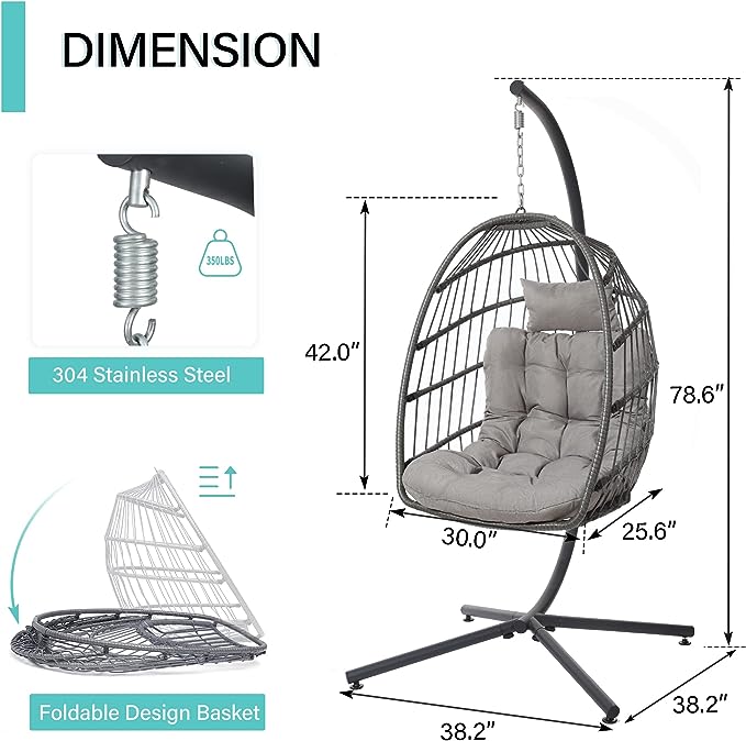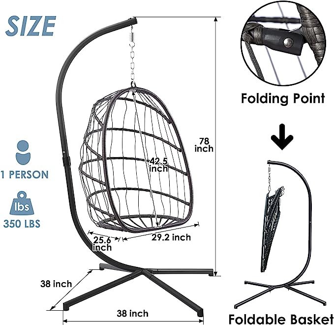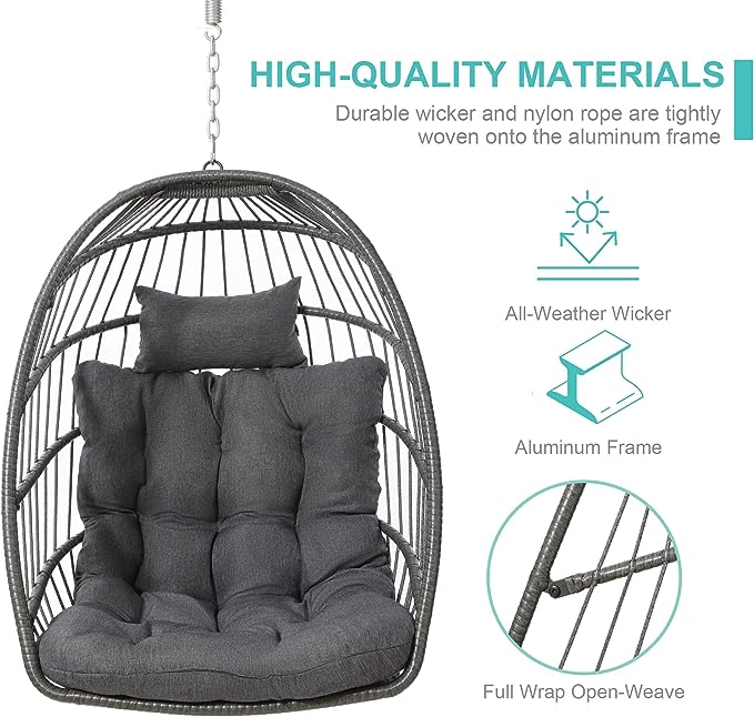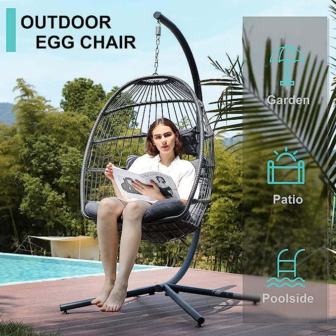 Yechen Indoor Outdoor Egg Hanging Chair with Stand, Patio Wicker Swing Egg Chair Indoor Swinging Chair Outdoor Hammock Egg Chair 350lbs Capacity for Patio Bedroom Balcony, Charcoal Grey (EG-001)