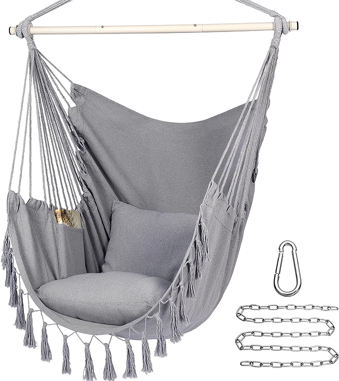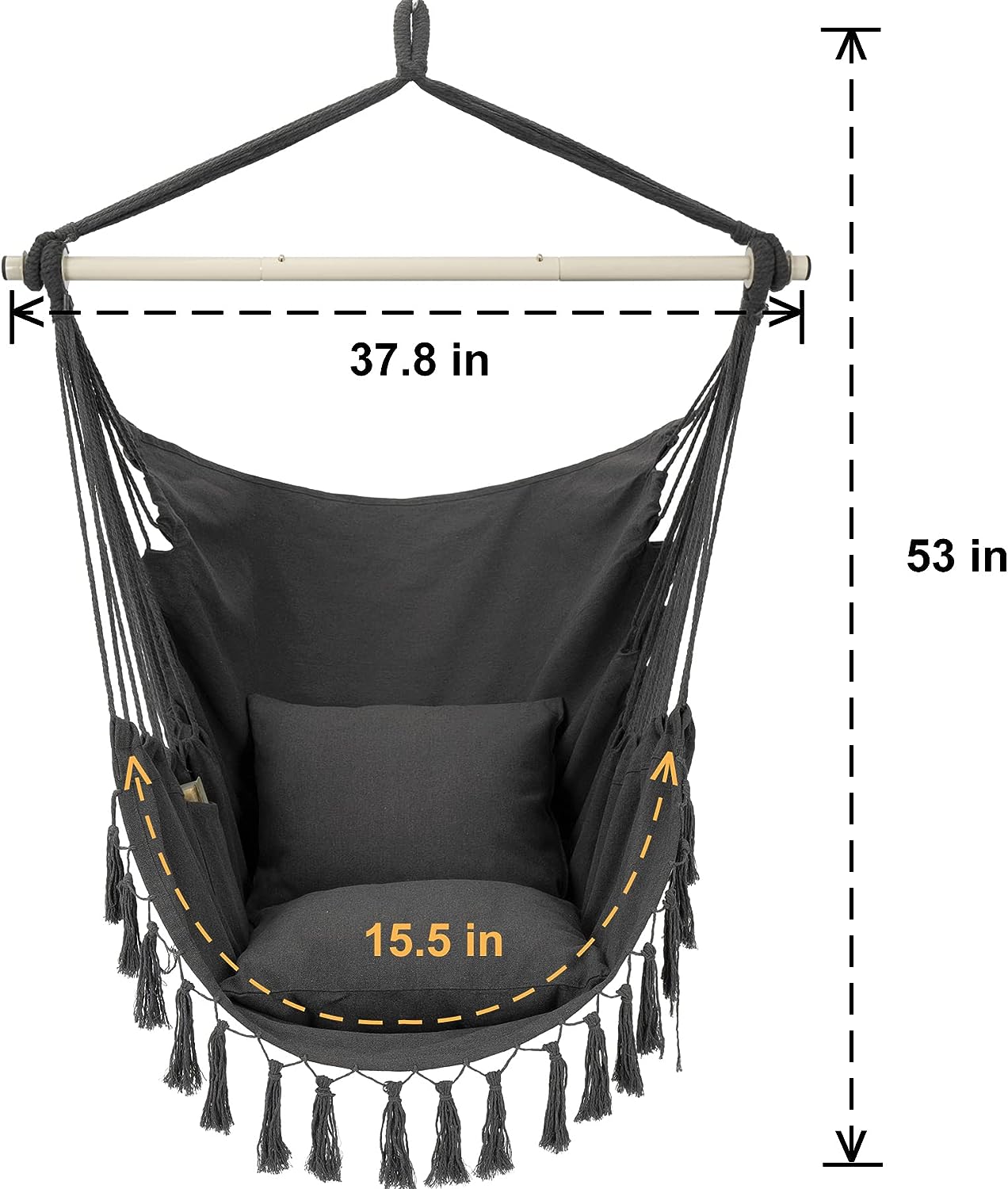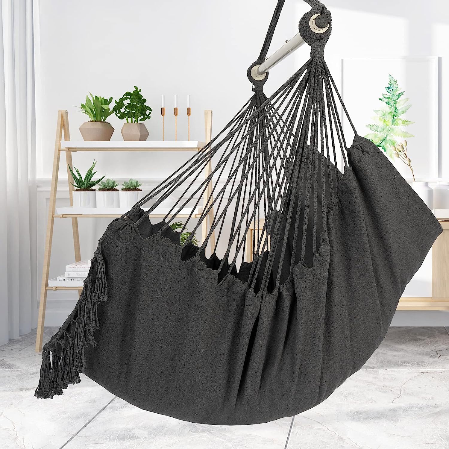 Y- Stop Hammock Chair Hanging Rope Swing, Max 500 Lbs, 2 Cushions Included, Large Macrame Hanging Chair with Pocket for Superior Comfort, with Hardware Kit (Dark Grey)