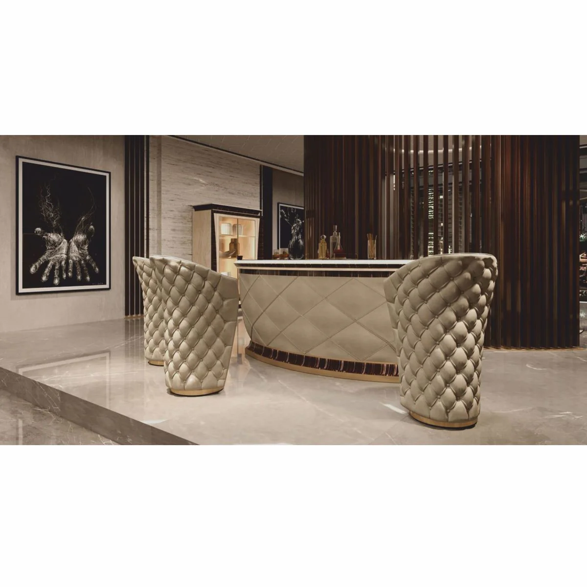 Casa Padrino Barra de Bar de Lujo con Refrigerador Beige / Negro / Oro / Bronce 225 x 102 x A. 98 cm - Mesa de Bar Hecha a Mano - Bar en Casa - Muebles de Hotel - Calidad de Lujo - Hecho en Italia