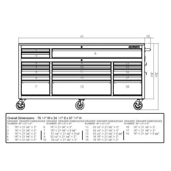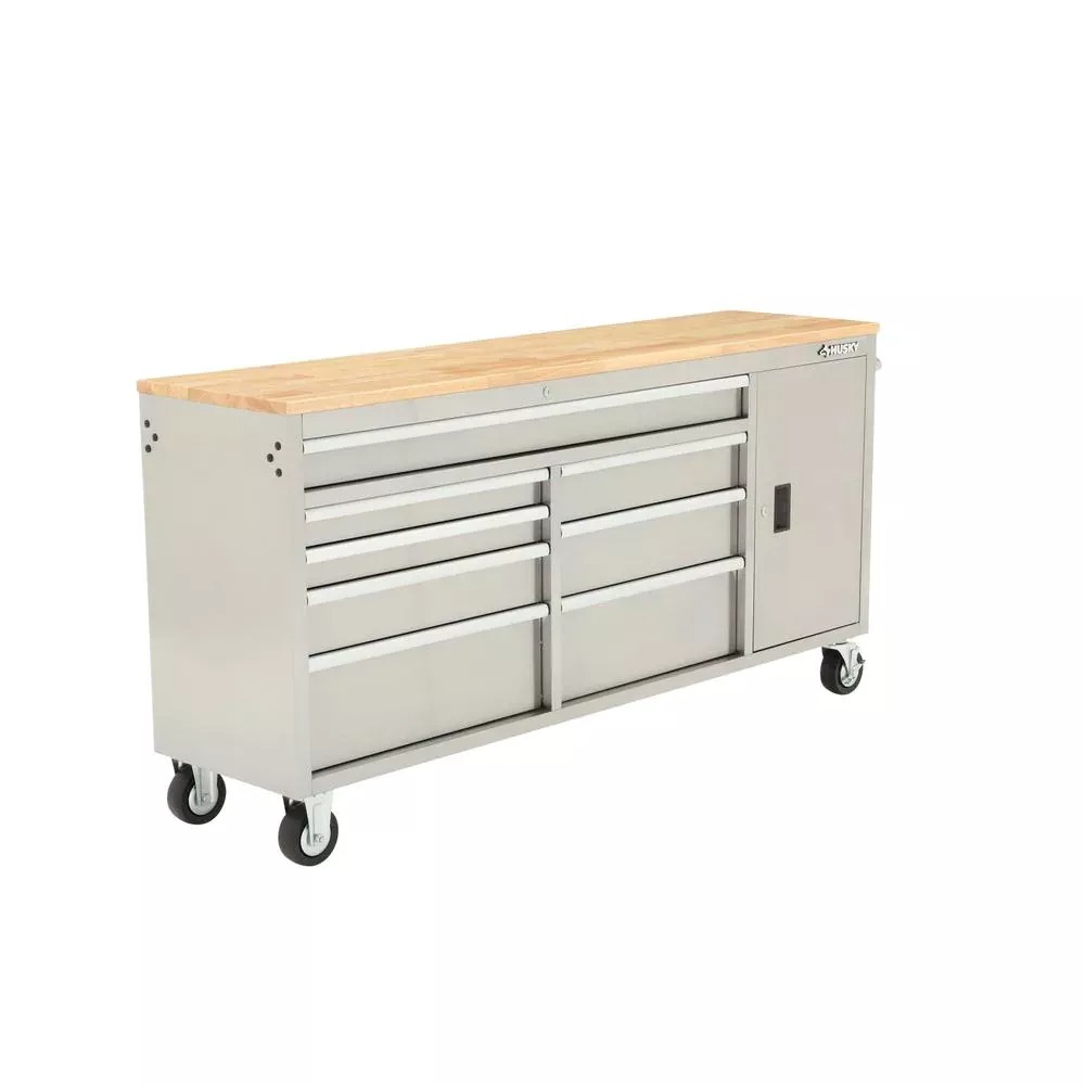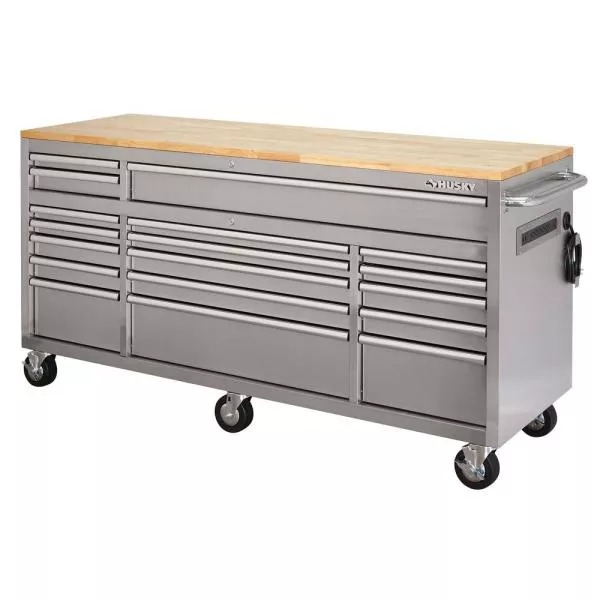 72 IN. 18-DRAWER 24 IN. D MOBILE WORKBENCH WITH SOLID WOOD TOP STAINLESS STEEL